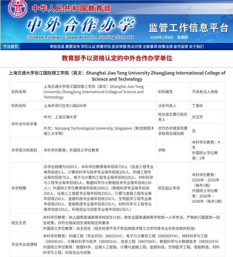 中国青年报客户端讯(中青报·中青网记者王烨捷)记者1月8日从上海交通大学获悉,由上海交通大学与新加坡南洋理工大学合作举办的上海交通大学张江国际理工学院已获教育部批准。教育部官网数据显示,该学院坐落于上海市浦东新区的张江高科技园区,2026年起招生,每年招收本科生750人,外国硕士学位教育每年招收2000人,总办学规模为5000人。
